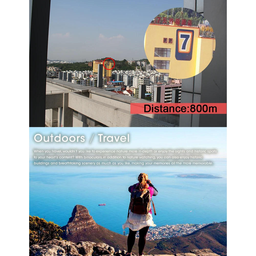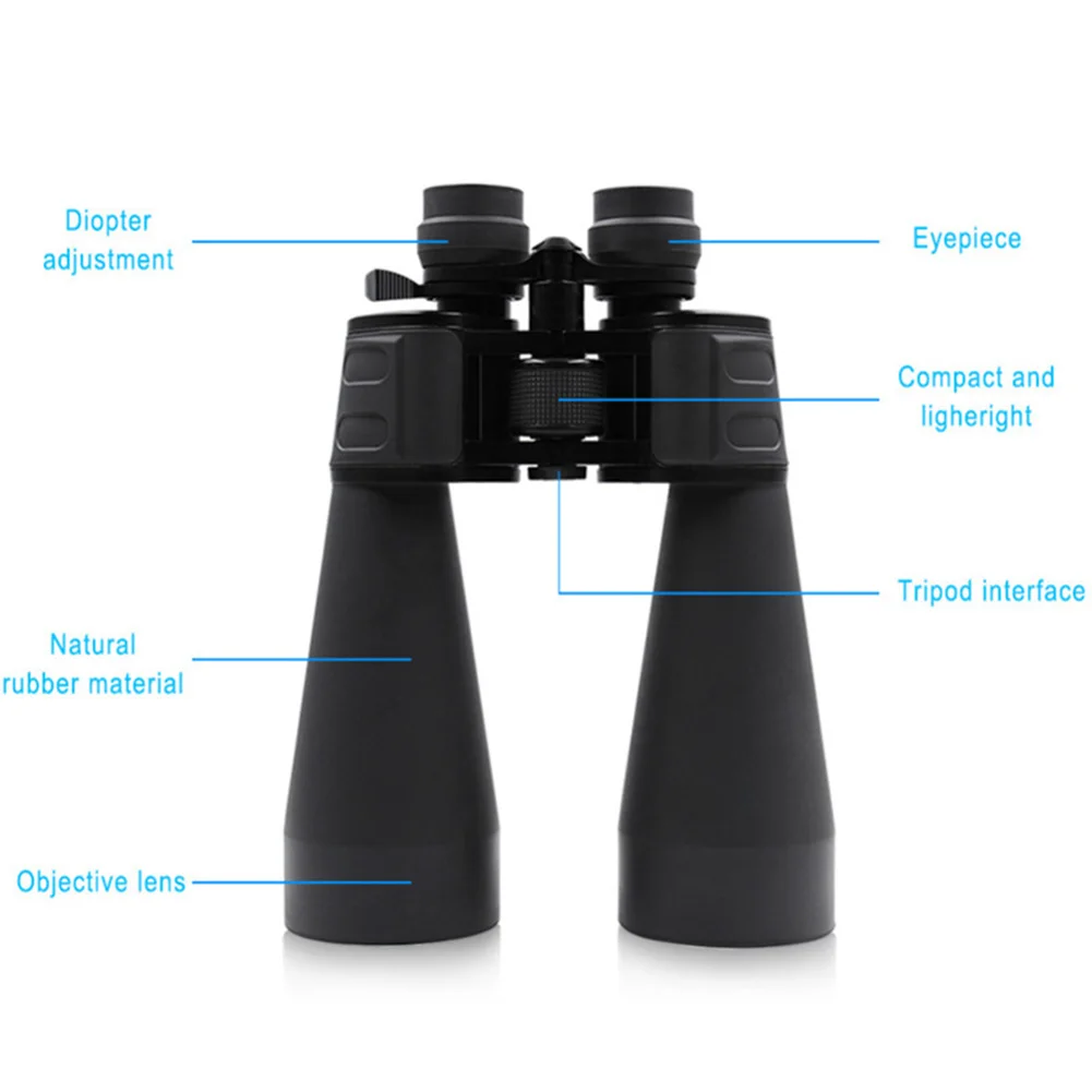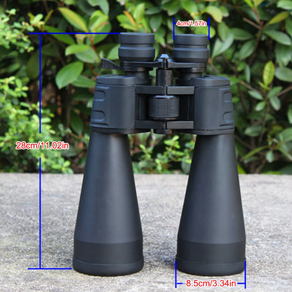 Feature: 1. High Magnification: With a magnification range of 20-180x, these binoculars provide a clear and detailed view of distant objects in high definition, making them ideal for astronomy, bird watching, and other outdoor activities. 2. Adjustable Pupil Distance: Designed to accommodate all ages and eye sizes, this telescope features an adjustable pupil distance that makes it comfortable to use for everyone. 3. Optical Quality: Equipped with FMC multi-coated lenses and BAK4 pure optical glass, these binoculars deliver bright, sharp, and color-accurate images with minimal distortion or glare, even in low light conditions. 4. : Built to withstand rugged outdoor environments, these binoculars are made with high quality materials and are designed to be waterproof, dustproof, and shock-resistant, ensuring long-lasting durability and reliability. 5. Versatile Functionality: Whether you're an amateur astronomer, a bird-watching enthusiast, or a professional outdoorsman, these binoculars are a must-have accessory that will help you see the world in a whole new way. Specification: Origin: Mainland China Type: Binoculars Product size: 28cm/11.02in * 23cm/9.06in Magnification: 20-180x Prism: BAK4 prism Eyepiece diameter: 18mm Objective lens diameter: 70mm Lens coating: FMC multi-layer broadband coating Field of view (m/°): 56M@1000M /4.2 ° Focusing method: center right eye focusing Comfortable distance: 20m-5000m Net weight of product: 1280g Waterproof grade: IPX4