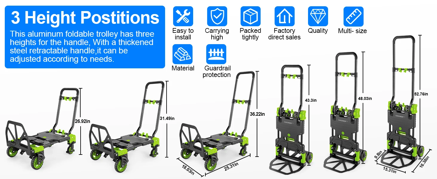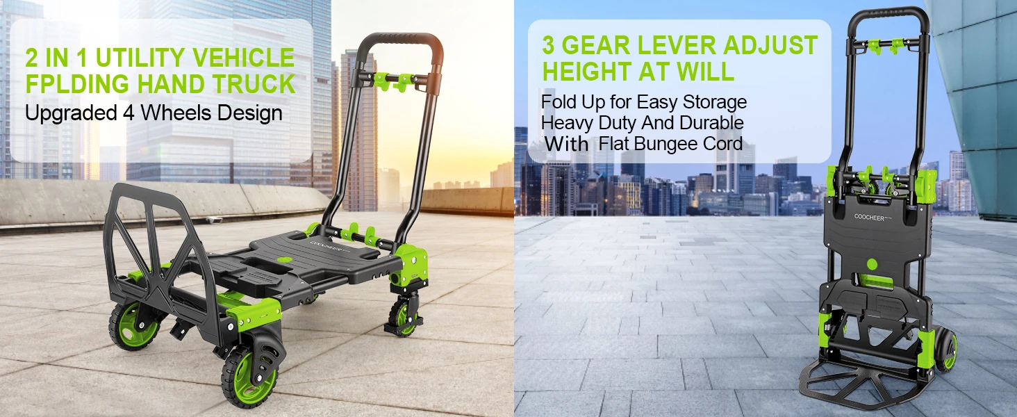 1. 💚💚Max Weight 330LBS👉 This is a folding hand truck which is made of Aluminum alloy and plastic. Let COOCHEER rugged dolly helps moving heavy boxes, luggage, and more, providing you with an easy shopping experience and a happy outing work!