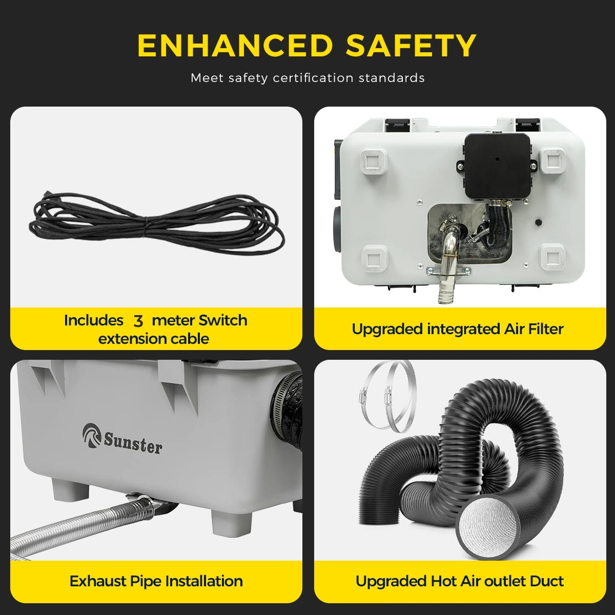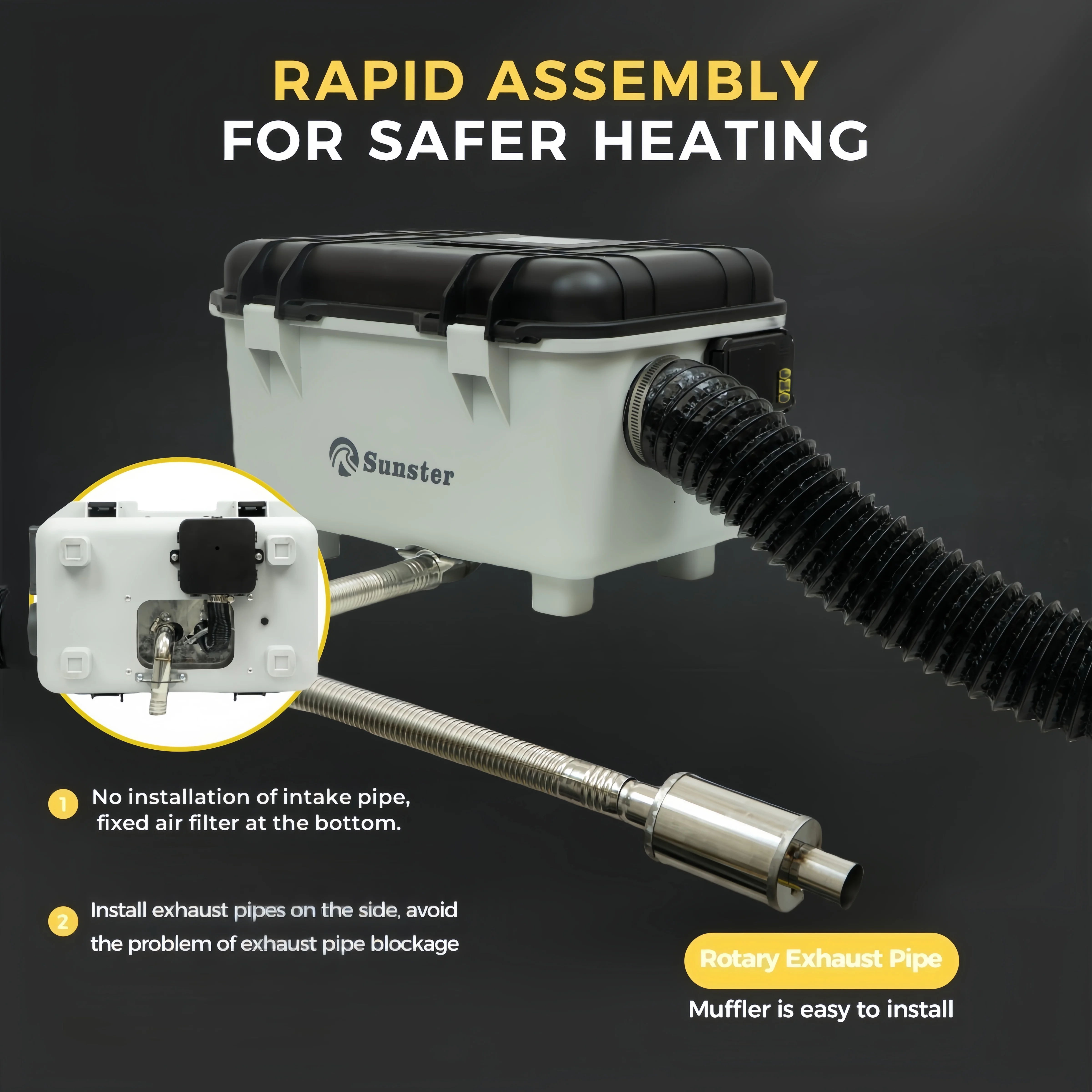 Upgraded fuel pump ----Configure ultra quiet oil pump to reduce operating noise by 50%: This diesel heater is designed with a premium muffler and fuel pump to minimize noise, operating at ≤35dB.Enjoy a warm, uninterrupted sleep during RV stays or outdoor camping, free from the cold.