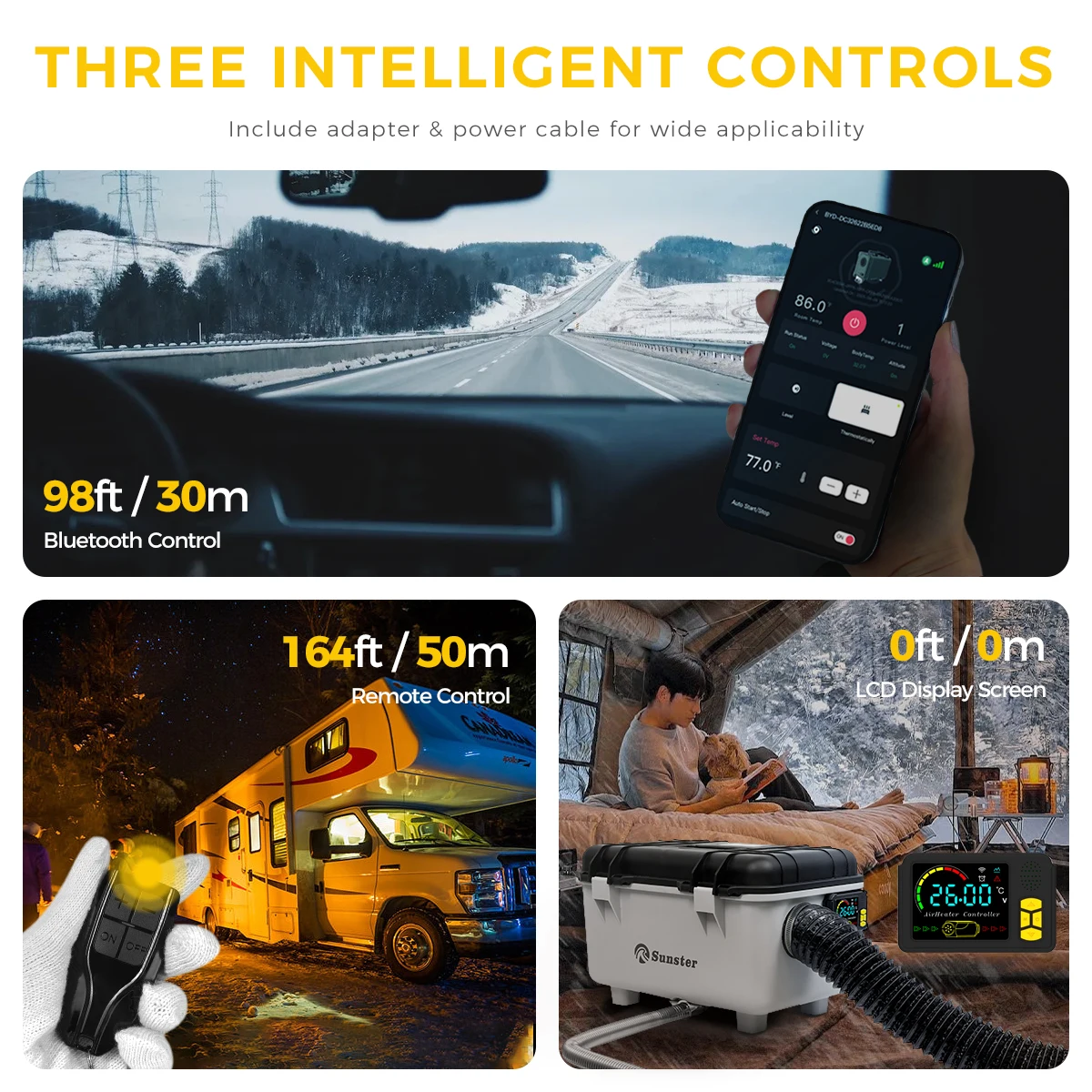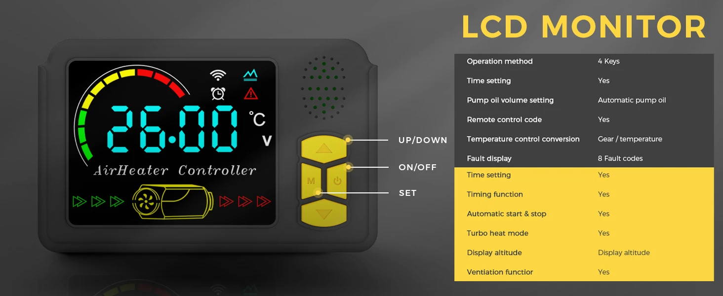 Efficient and fast heating: heater power: 8KW; rated voltage: 12V and 24V, adapter: AC: 110-240V. Scope of application: 215-269 square feet/20-25 square meters. Ensure a quick and comfortable temperature within just 10 minutes.