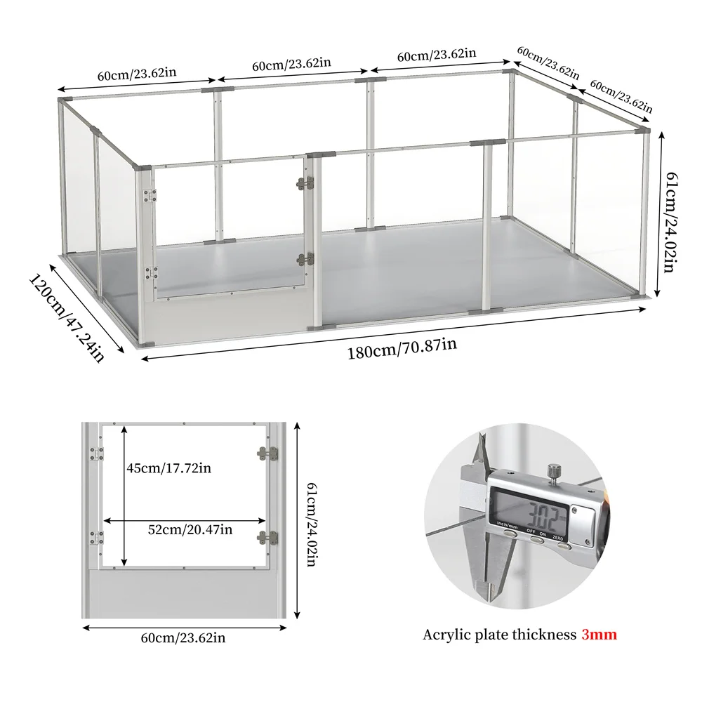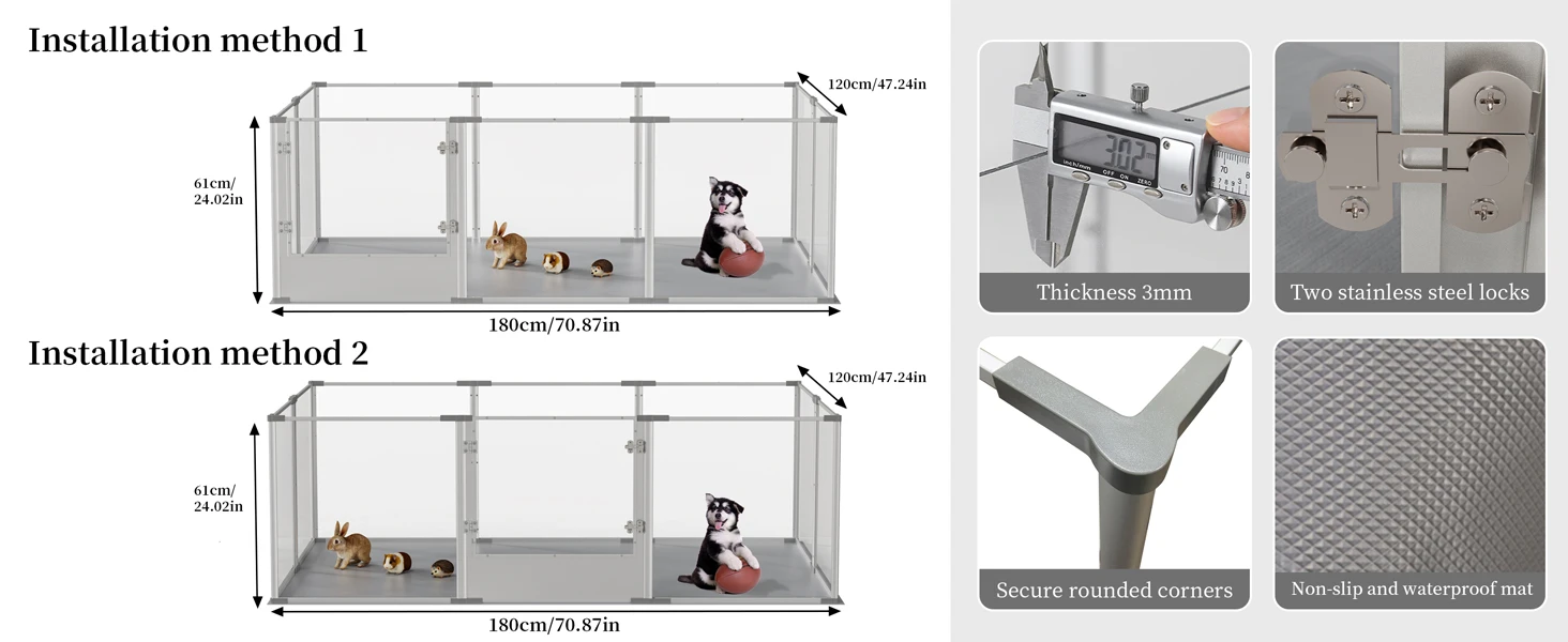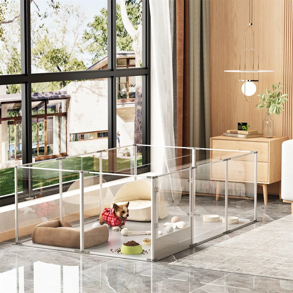 Use Breakthrough Materials - Barbed wire fences are easy to rust, and wooden fences are easy to be affected by moisture, we break through the traditional thinking and use a scratch-resistant acrylic panel with a thickness of 3mm combined with an anti-oxidation aviation aluminum frame to make a pet playpen, the splicing interface part adopts our patented technology, which is easy to assemble,with non-slip floor mat, it is not easy to move