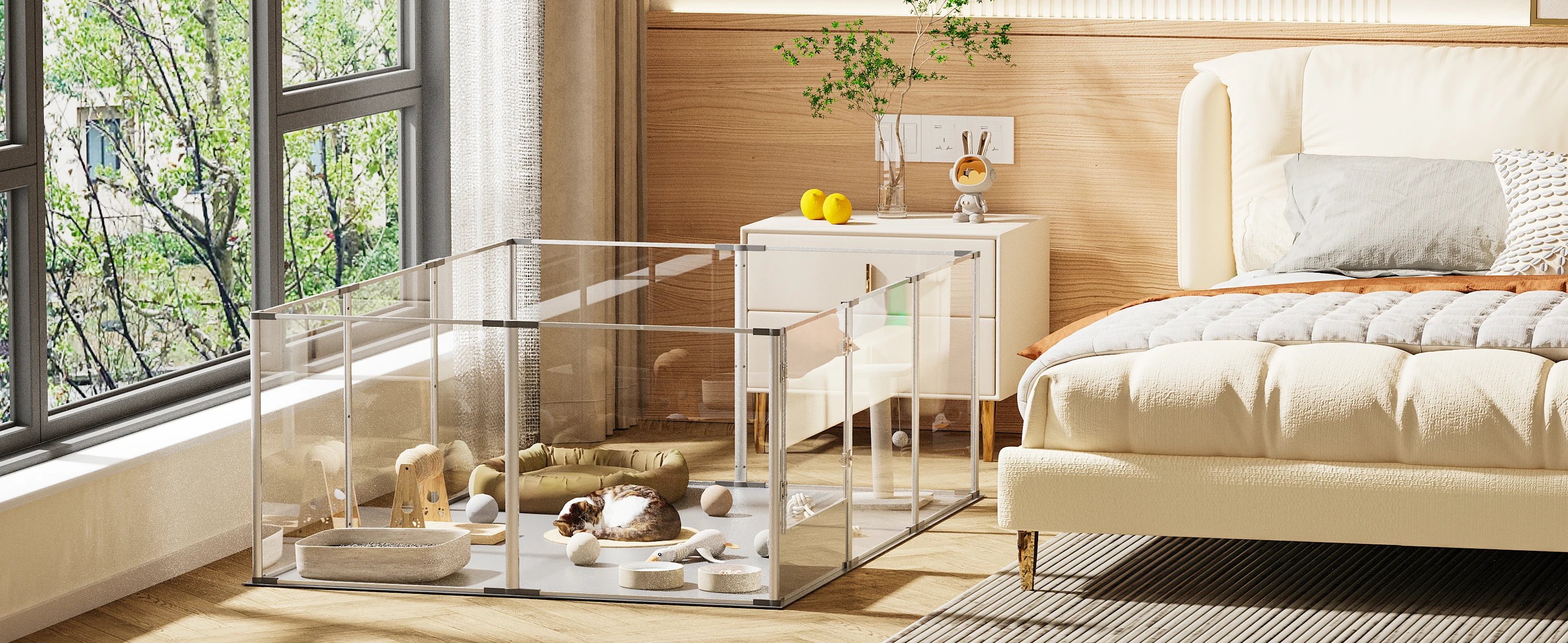 Modern Style Design - The crystal-clear acrylic fence is convenient for you to interact closely with your pets at close range, the open design and 360°wide field of vision allow you to observe your pets from all angles, this design can reduce the anxiety of pet, suitable for your living room, bedroom, stairway, etc., perfectly blended with your home decoration